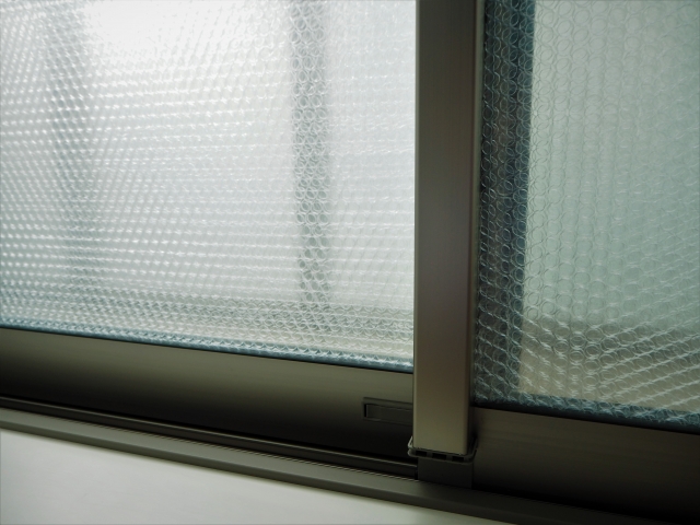 ガラスに貼るだけ。ネットやホームセンターで買ってDIY。冷気をやわらげる効果があります。